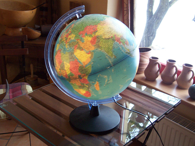 Leuchtglobus blickt aus dem Fenster zum winterlichen Garten.