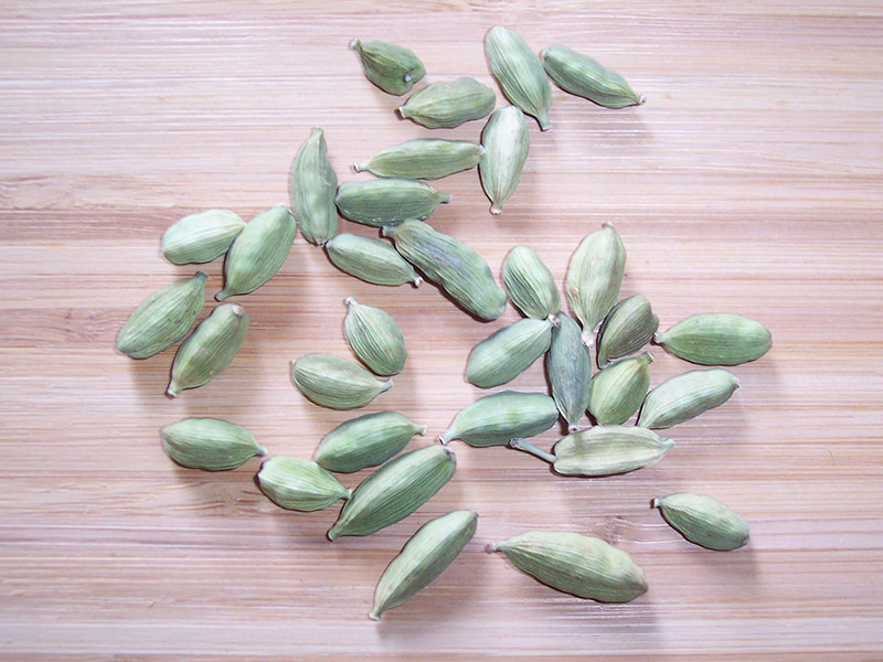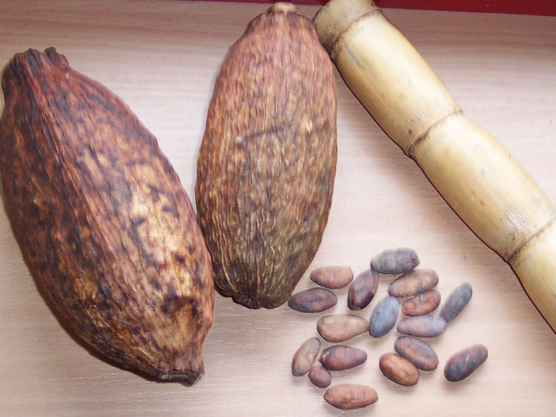 Getrocknete Kakaoschoten, Kakaosamen und Zuckerrohr.