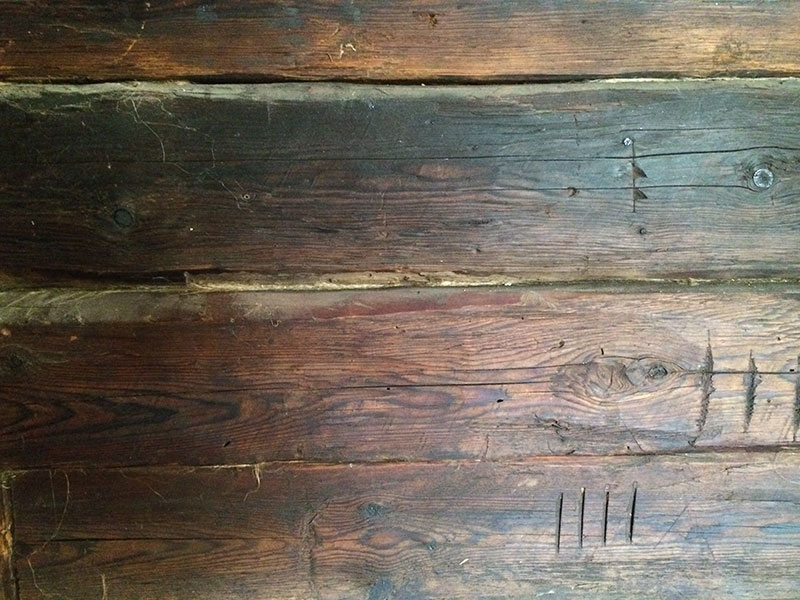 Ehemalige Wand-Deko aus Pergament, Nägeln und Katalogbildern.