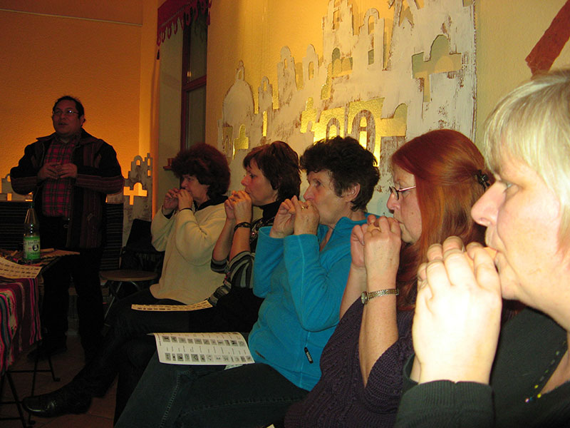 September 2015. Carlos Sánchez-Chinén bringt unserem Ladenteam Ocarina-Töne bei.