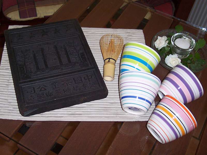 Chinesischer Teeziegel, japanischer Teebesen und Teeschalen.